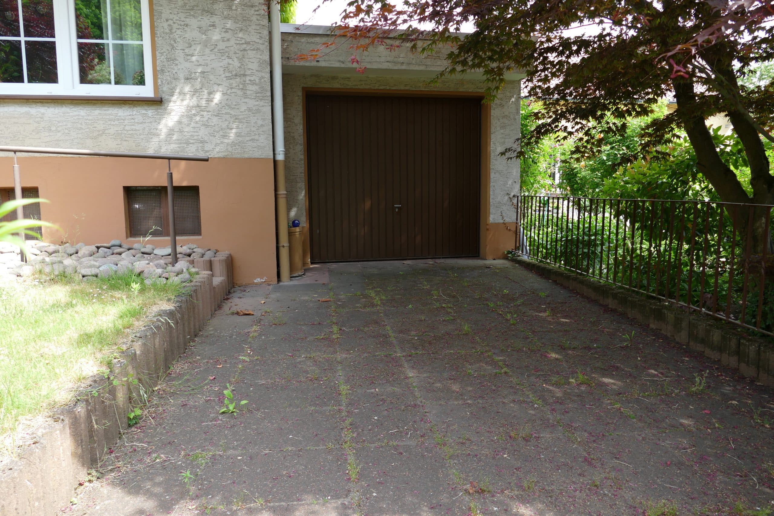 Zur Straßenseite hin führt eine Zufahrt zur Garage, die direkt an das Haus angrenzt.